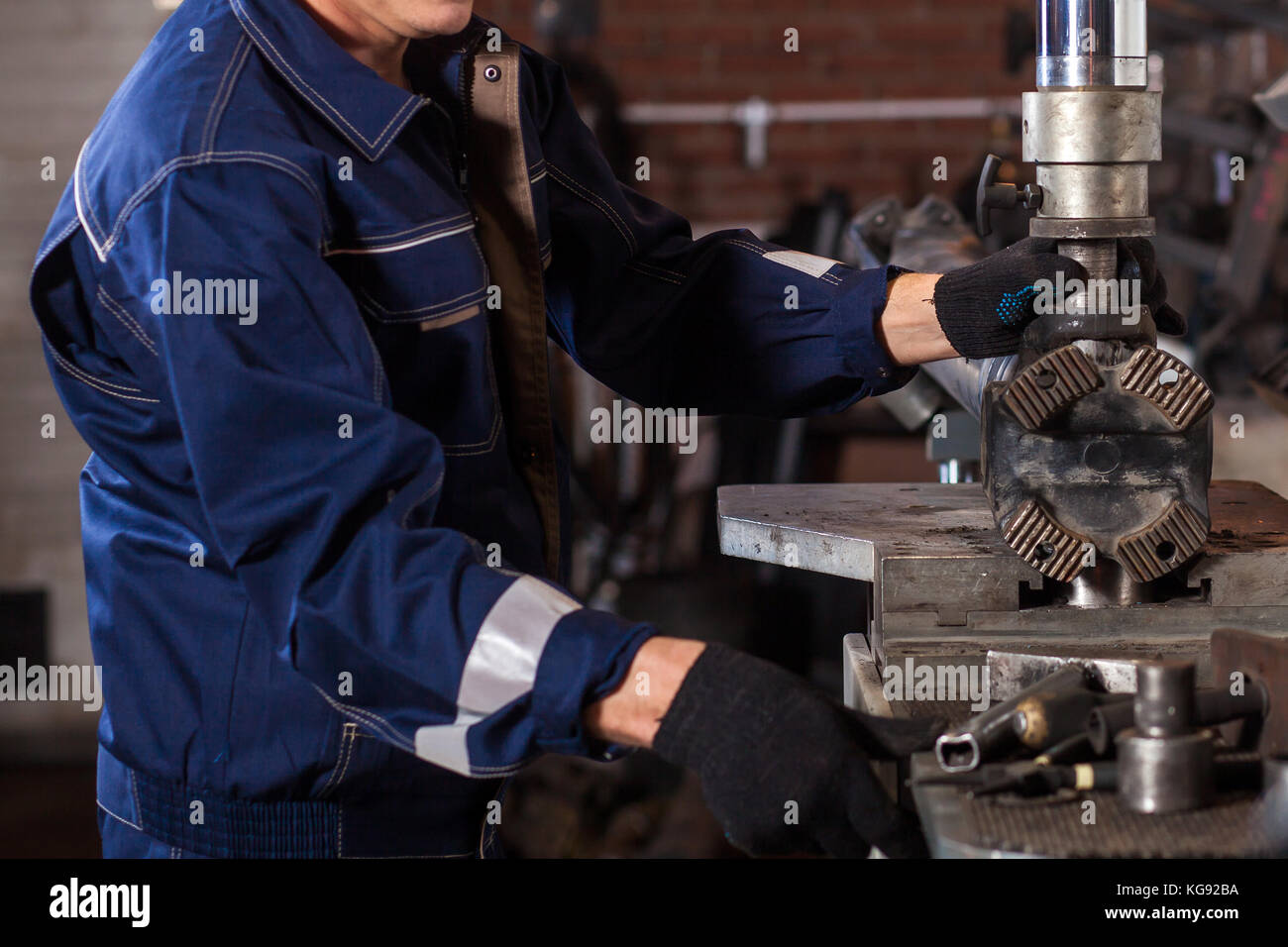 Close Up Of A Fitter In A Blue Uniform Working On On An Automatic Welding Machine For The Repair The Man Works At The Plant For The Production Of Ca Stock Photo